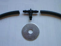 A 4" clay pot is buried. One 1/4" tube is the water feed. The second 1/4" tube allows air to flow out when the pot is filling with water. Once the clay pot is filled with water, water travels through this second tube to the next clay pot in the series.